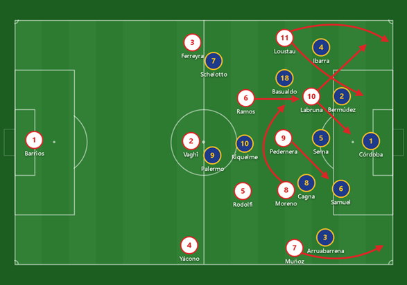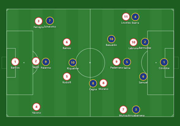 Boca jugaba con un muy típico 4-3-1-2 o 4-2-2-2. Con cuatro defensores en zona, dos de ellos laterales muy ofensivos; un volante tapón, acompañado de dos trabajadores de la media cancha como Basualdo y Diego Cagna; un solo creador que era Juan Román Riquelme, y una dupla de atacantes, uno por afuera (Guillermo Barros Schelotto, cambiando constantemente de banda) y otro por adentro (el goleador Martín Palermo).