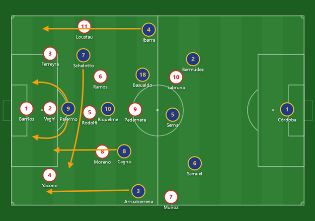 - Aislar a los de arriba: Habría que desarmar el circuito Schelotto-Riquelme-Palermo. Para eso River cuenta con tres jugadores defensivos especializados en marca personal (Yácono, Rodolfi y Vaghi).