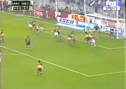 Angelito deja pasar hábilmente la pelota y le llega a Loustau, quien la empalma a la carrera en dirección al primer palo con un fortísimo tiro. Ataja el arquero, Óscar Córdoba, mandándola al córner. Frente a la Máquina está nada más ni nada menos que el Boca de Bianchi, modelo 1998/99, el de los 40 partidos invicto.