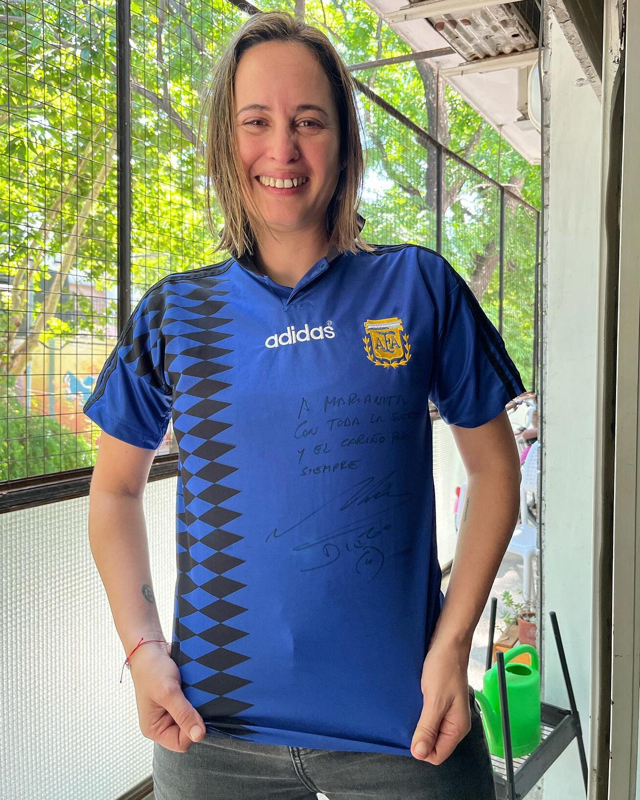 MC: Cuando abren la plaza para el hospital de día, voy a buscar todas mis cosas y Diego me dice “te traje esto” y me firma el libro Yo soy el Diego. Y además que había pedido que le trajeran una camiseta. Y ahí me acordé de la camiseta que me había regalado mi bisabuelo Daniel en San Luis, la camiseta azul del ’94. Llamé a mi mamá para que me la traiga y él me la firmó: “Para Marianita con mucho amor”.